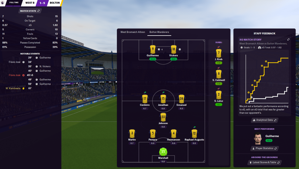 We then went to Newcastle, absolutely dominated them and made it count with goals from centre-back Hermansen and Jonathan curling in his first Bolton goal. We somehow allowed our former loanee Stamenkovic to get one back with their second shot just before half-time but Caldwell scored a long-ranger on his 200th Bolton league appearance to settle any nerves. This was easily our most dominant performance in the Premier League, as we had a huge 38 shots – of which Caldwell had 11 and Jonathan had nine! – but settled for three, with Hansen claiming two assists, eight key passes and an 8.4
