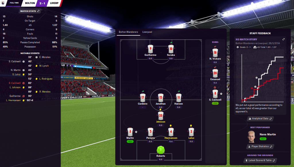 The Premier League resumed at home to bottom of the league Leicester, who’d just poached Raúl from Burnley. Things didn’t start well but holding midfielder Luke Johnson, who’d never scored a goal before this game, stepped up with two identical screamers to put us ahead. Fellow midfielder Sean Caldwell raced through to score a third and kill Leicester off and start 2034 with a bang.