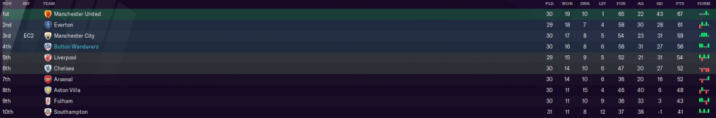With eight games remaining, our goal of finishing in the top half of the Premier League for the first time was looking good. We were fourth with 56 points, 15 clear of 10th place. European football was also a possibility but we were only four points ahead of Arsenal in seventh. But the season run-in was far from easy with three of the top five visiting Bolton.