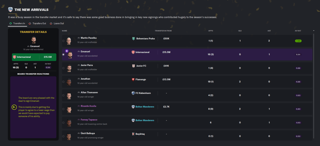 The most exciting is 19-year-old Emanuel, who comes in for a club record fee of £15.5 million from Internacional – surpassing the 26 year record that stood since Johan Elmander signed for £8 million. Nearly as exciting is fellow 19-year-old Brazilian Jonathan, for whom we met a £13.5 million minimum fee clause. I’m not sure how we fit both into the team, but Jonathan should be able to play as the box-to-box midfielder while Emanuel may rotate between the Mezzala and advanced playmaker. The duo take us to five wonderkids in the first-team squad alongside centre-backs Lasse Hermansen and Gonzalo Pereyra and midfielder Mathias Hansen.