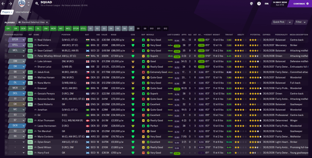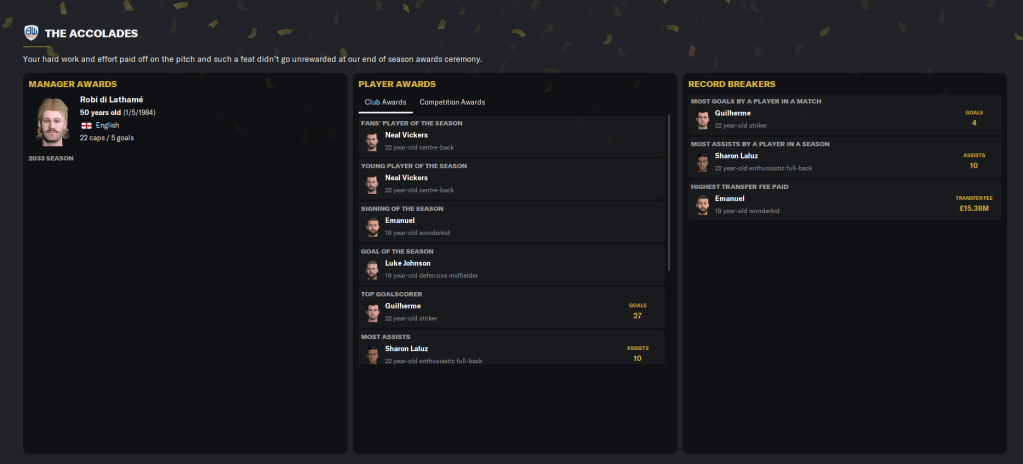 That said, we were eight points clear of eighth place with just three games remaining. First up was Wolves away and another Guilherme brace sealed seventh place. That helped him win April player of the month, despite Liverpool’s ridiculous young striker Eder Morales scoring nine in four games. Our final away day of the season was at mid-table Leeds, where we somehow lost 3-0 despite having 25 shots to their 11. Despite that, we qualified for the Europa Conference League, which meant Bolton Wanderers would be back in Europe for the first time in 27 years next season!
