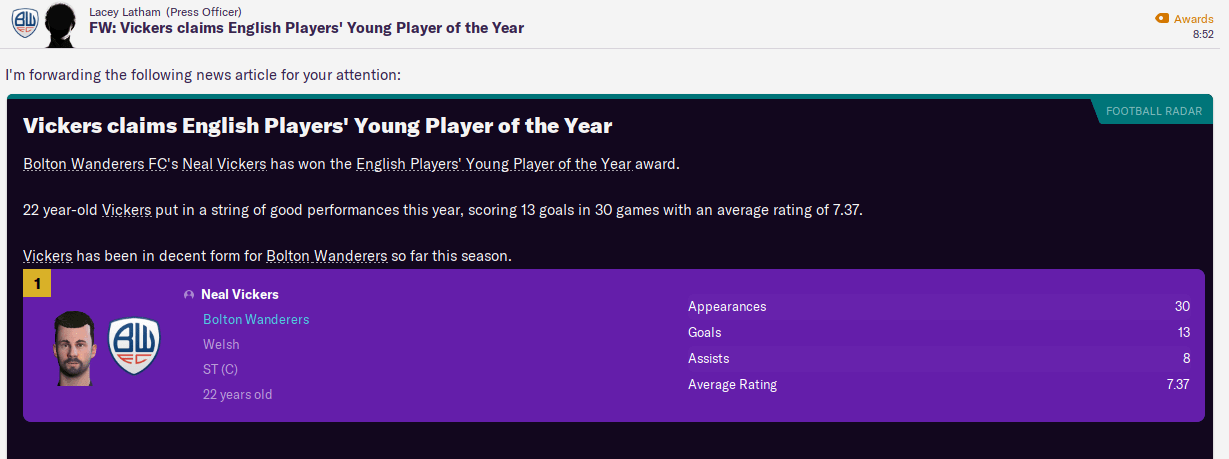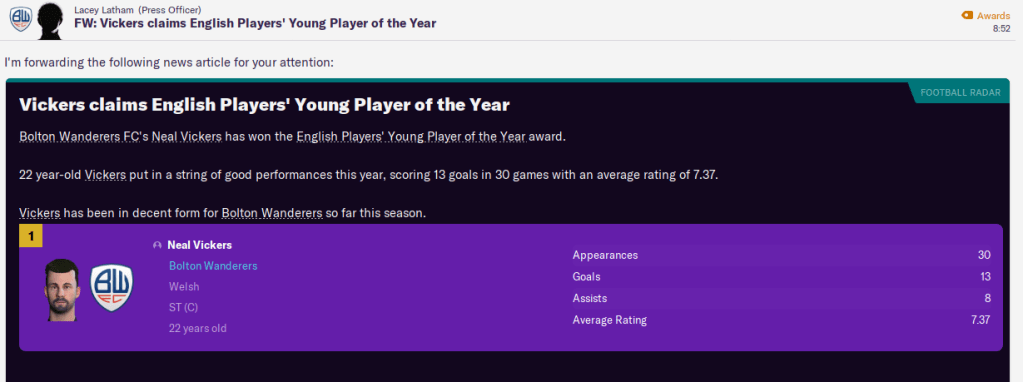 Vickers won fans’ player of the season and young player of the season, Johnson won goal of the season for a strike against Leicester that came third in the league’s goal of the season, Emanuel won signing of the season. Even more impressively, Neal Vickers won the English Players’ Young Player of the Year award. What a hero!