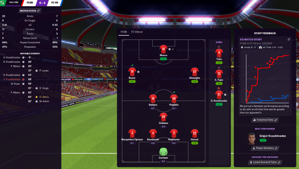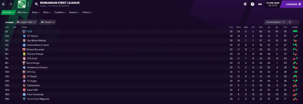 It began at home to Metan Medias, who impressively finished third after coming 13th last season. FCSB routed them again though, this time winning 4-0 inspired by a Kvaskhadze brace. They went behind at Petrolul but fired back to win 3-1 thanks to Kvaskhvadze again and a Moscu brace. A run of seven straight wins ended with a 1-0 loss at Craiova on the same day Viitorul lost at home to Petrolul.