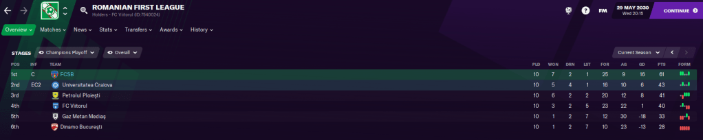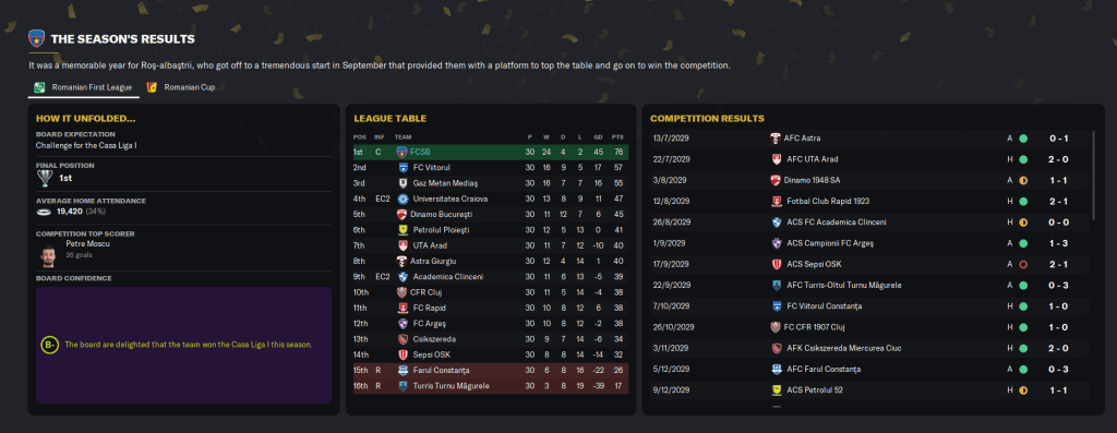 The season ended with two more wins, including a 1-0 win at Craiova. And that ensured FCSB finished top on 76 points, scoring 60 and conceding just15.