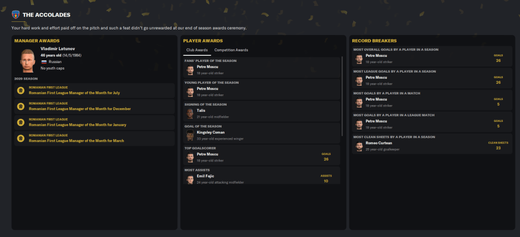 That ensured Latunov won the Romanian title at the first time of asking and wrapped up the sixth of his target of 13 national titles around Eastern Europe. FCSB won the title by a huge 18 points, scoring a total of 85 goals and conceding just 24 in 40 matches. Moscu finished the season as the league’s top scoreer with 26 goals, Coman had the highest average rating of 7.34 and Curtean kept 23 clean sheets.