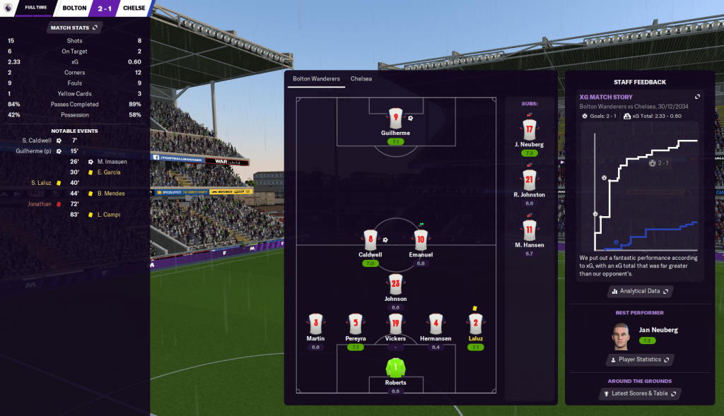 I made a few changes for the Chelsea game and it worked as Neuberg came in to setup Caldwell’s opener then win a penalty that Guilherme converted. Chelsea got one back then Jonathan idiotically got himself sent off minutes after coming on, but we went defensive and held on for a huge 2-1 win.