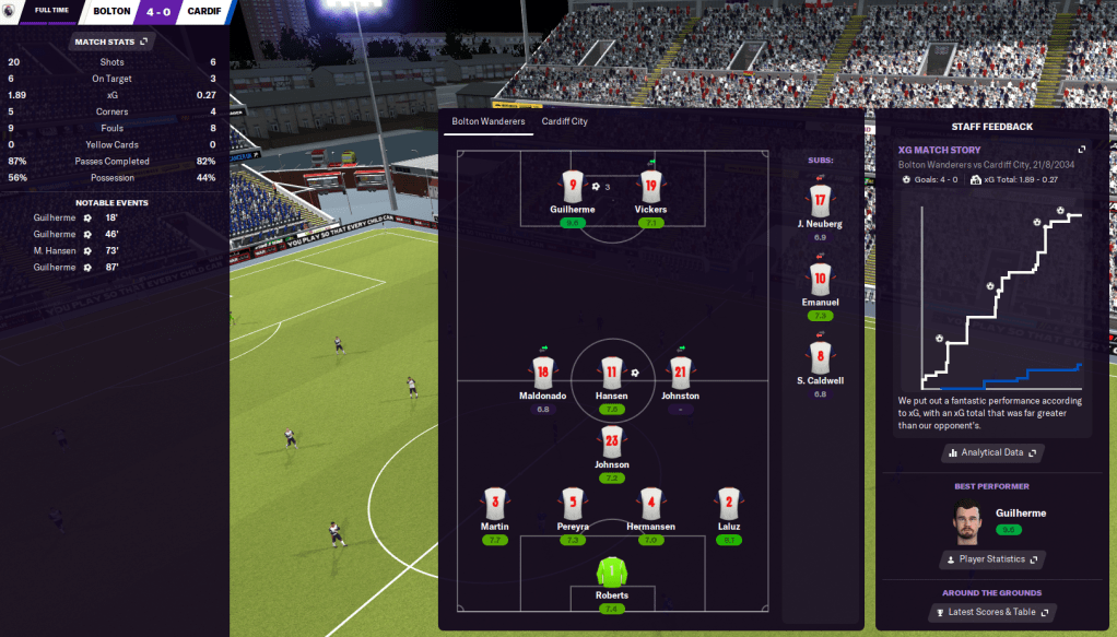 That was followed by three successive league games, which started with Emanuel impressing again against newly promoted Cardiff. He created the opener for Guilherme, who doubled his tally in the first minute of the second half then completed a brilliant hat-trick late on, with Mathias Hansen scoring the other in a 4-0 win. Next, Suraka come back to Bolton with Wolves but couldn’t haunt us as the front two of Guilherme and Neal Vickers scored to seal a 2-0 win. Struggling Leicester followed and Guilherme turned on the style again with two first-half goals then wrapped up his hat-trick just after the hour mark to inspire a 3-1 win. The brilliant Brazilian has seven goals in four games.