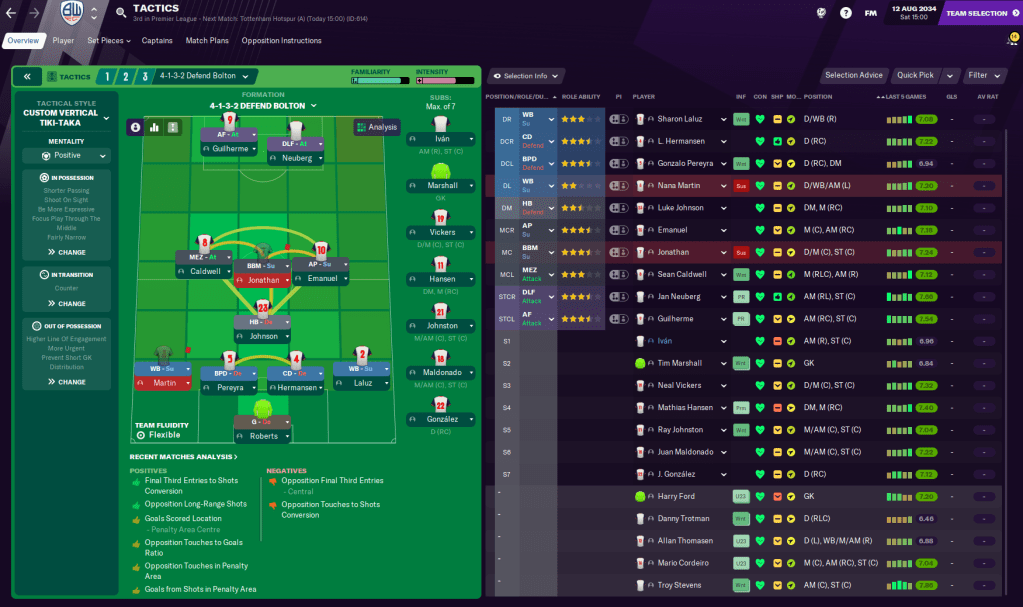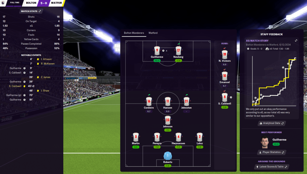 The 2034/35 campaign got off to a tricky start with a trip to Tottenham, which also happened to be my 700th match in charge of Bolton – which is only the 212 short of Charles Foweraker’s club record! Spurs started better and scored twice from indirect free-kicks, Emanuel scored his first Bolton goal to give us a chance, but we just lost out 2-1.