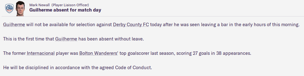Despite his great start to the season, Guilherme gave me cause for concern as he went AWOL and missed our game at Derby after being spotted on a night out. We laboured a little without him but Sean Caldwell’s early goal was enough for a 1-0 win that took us second in the league.