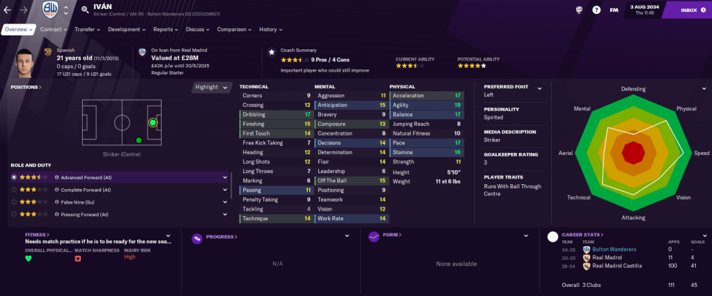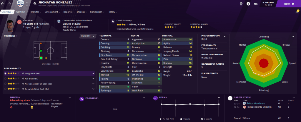 The rebuild began with very exciting Colombian right-back Jhonatan González, who got a scout report of 93- the highest we’ve yet received – and cost just £1.9 million from Independiente Medellín. We also added to our South American contingent with18-year-old Chilean Juan Maldonado, who came in on a free transfer from Universidad de Chile and I’m going to train up as a striker. We also replaced Suraka with the signing of 19-year-old Jan Neuberg, who cost just £5.5 million from Sparta Prague, and a loan deal for Real Madrid striker Iván.