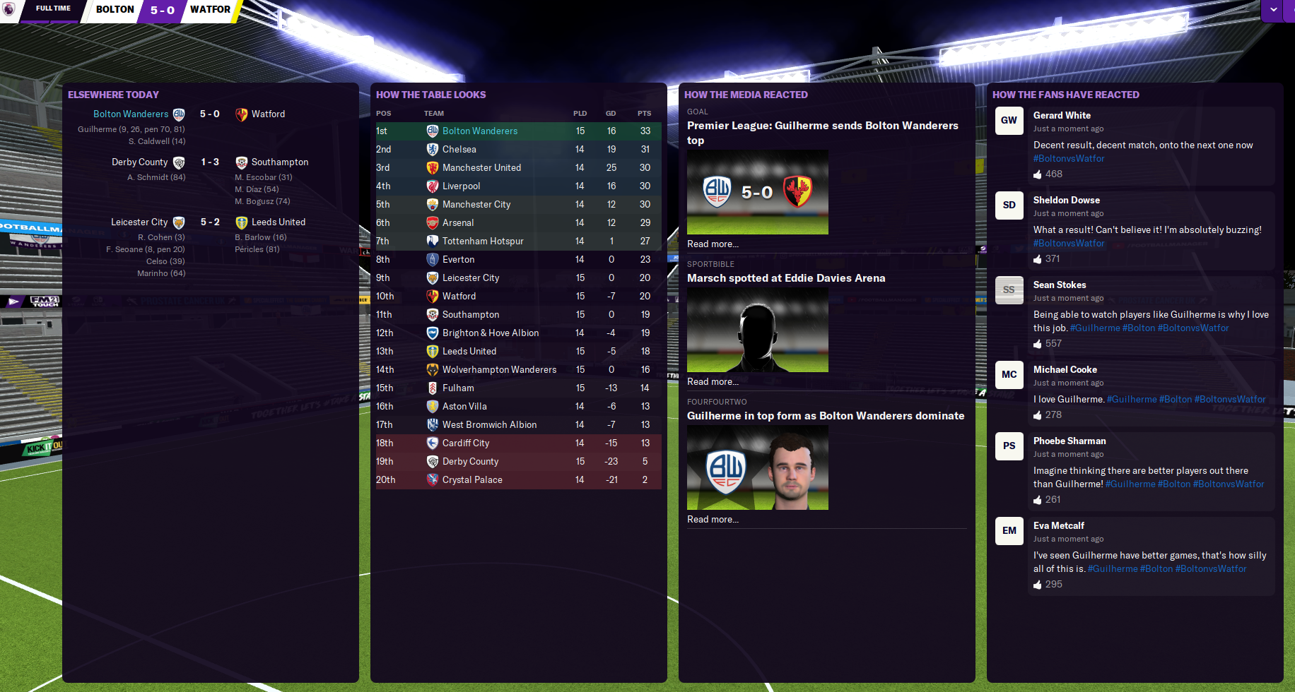 That ensured we finished 2034 sitting in fifth place in the Premier League with 13 wins, six defeats and still zero draws, only three points behind leaders Man United. We still have the best defence in the league and Guilherme is the top scorer in the league with 17 of our 30 goals. The Brazilian striker’s form saw him win Premier League Player of the Month in December. He is an absolute hero.