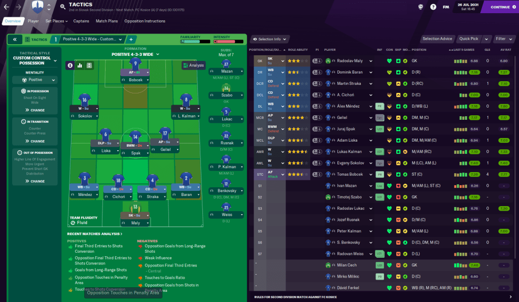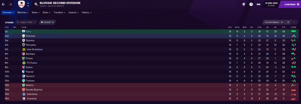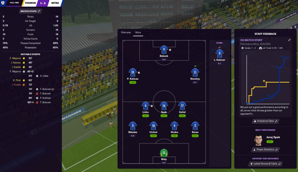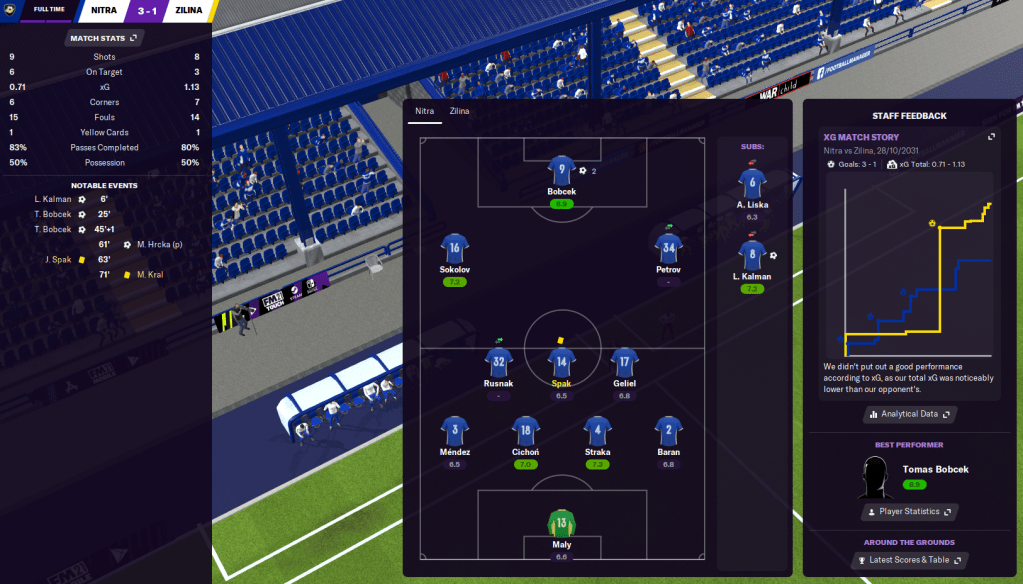 The unbeaten run continued through to 15 league games, including another away game where hosts Banska Bystrica didn’t manage a shot and Kalman and Bobcek sealed a 2-0 win. That took Nitra 10 points clear at the top with half the season gone, which they extended further in the next couple of games. 2031 concluded with a Sokolov brace and another Bobcek penalty, which were enough for a 3-2 win at Gabcikovo.