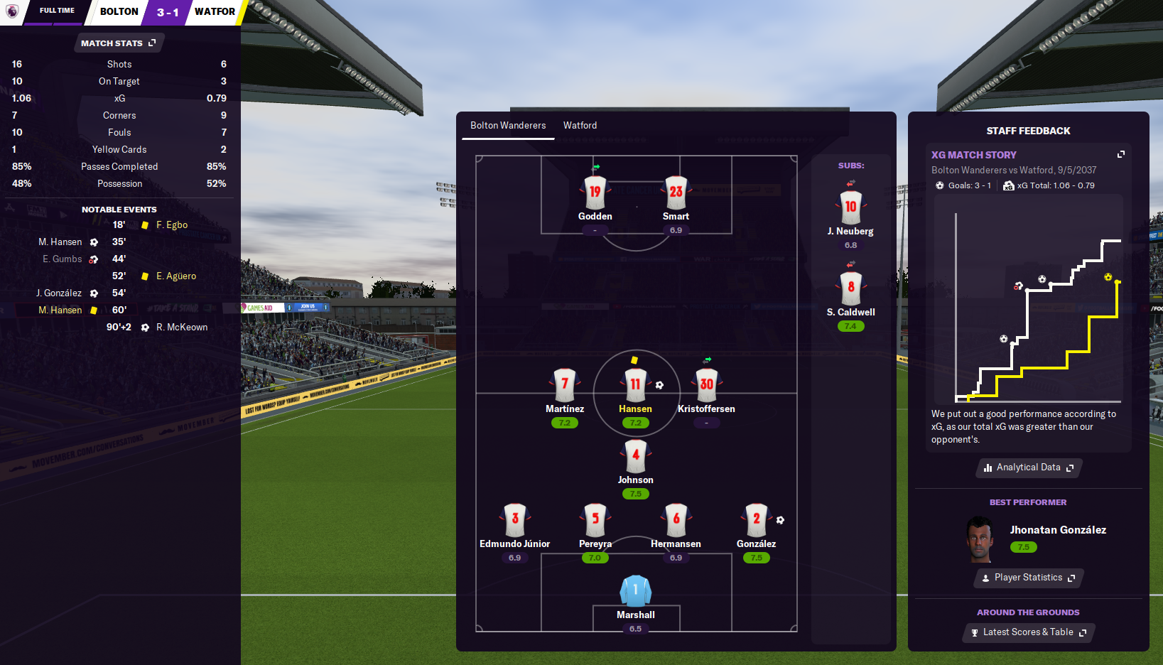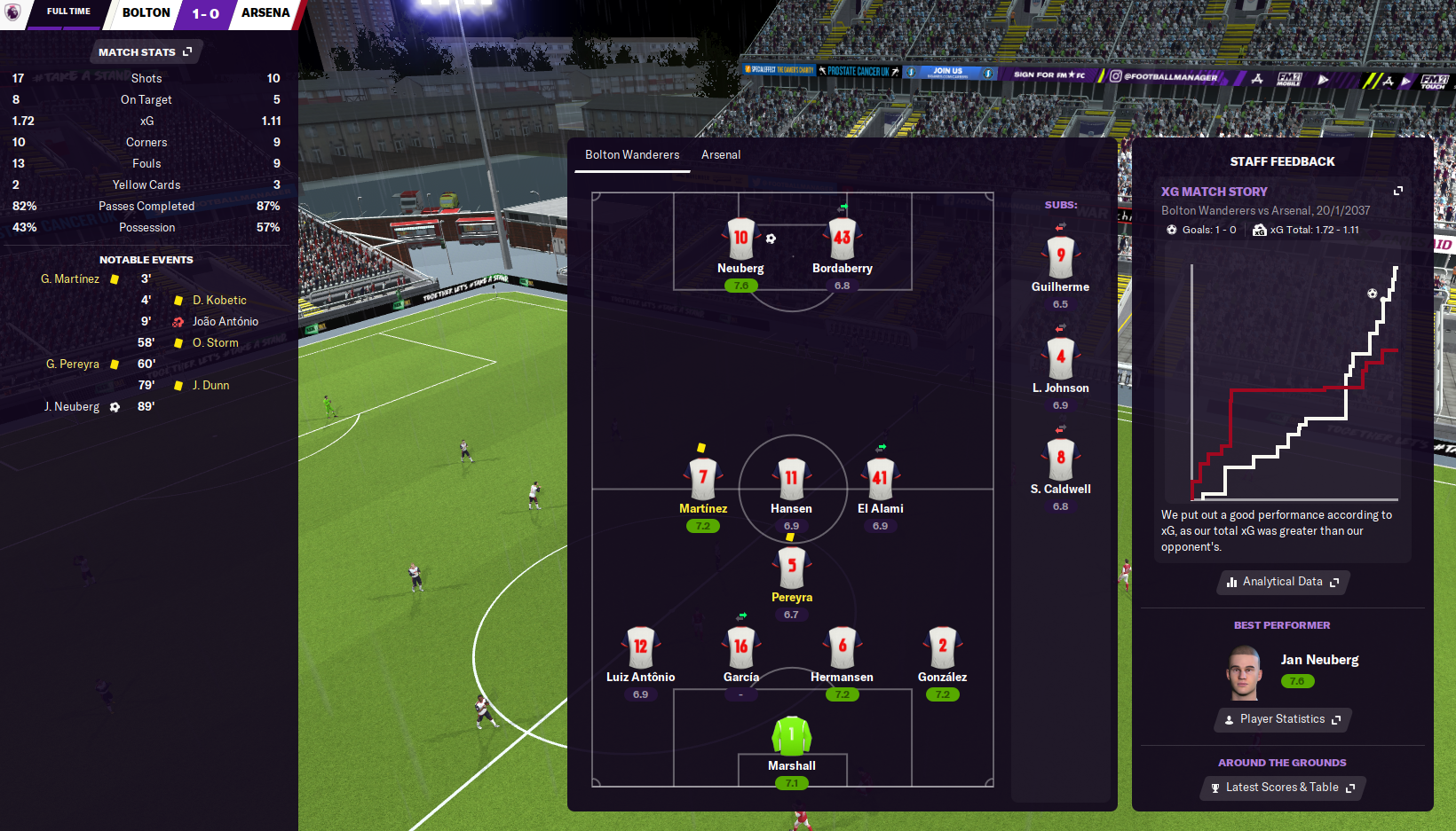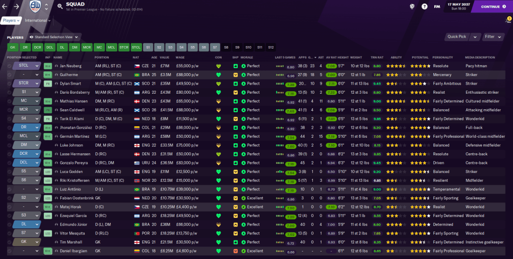 A maiden Premier League title defence hadn’t started overly well but a strong end to 2036 saw Bolton Wanderers slash the gap to early pacesetters Arsenal and Tottenham. That had been largely inspired by Under 21 World Player of the Year, Jan Neuberg, who scored more than a goal a game after star striker Guilherme had been sent to the naughty step.