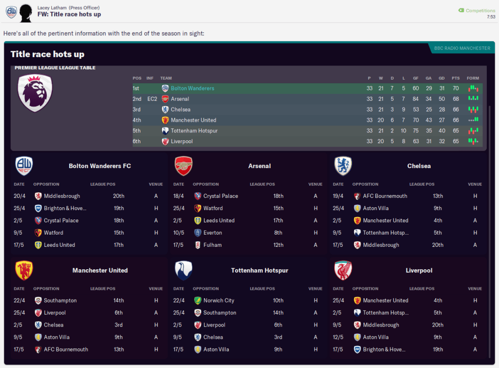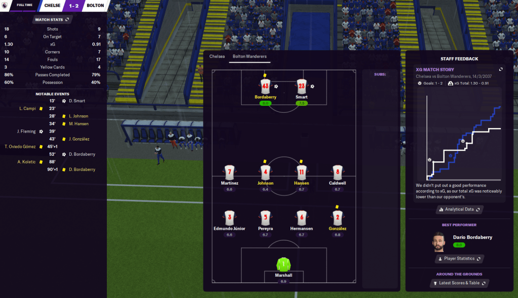 I threw a tactical gamble with a largely untested, more cautious 4-4-2 and we started well as Smart opened the scoring after 13 minutes. Chelsea scored a screamer to equalise just before half-time but Bordaberry broke away from our corner to score an excellent solo goal. Chelsea went for it and we just about held firm to deny them and come away with a massive win. Arsenal drew 3-3 at United on the same day to move us five points clear.