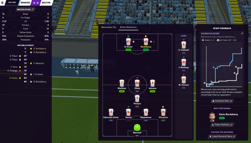 Two much tougher tests soon followed, beginning with a trip to Man City. We got off to a flyer as Bordaberry latched onto a long ball to get his first goal back at the club. City struck back with a brace from superstar winger Danilo Pisani and looked to be cruising to a 2-1 win. But a tactical tweak that involved El Alami coming on for a league debut as a makeshift striker saw him equalise then tee up a dramatic winner for Bordaberry. A massive win temporarily took us top of the league for the first time this season.