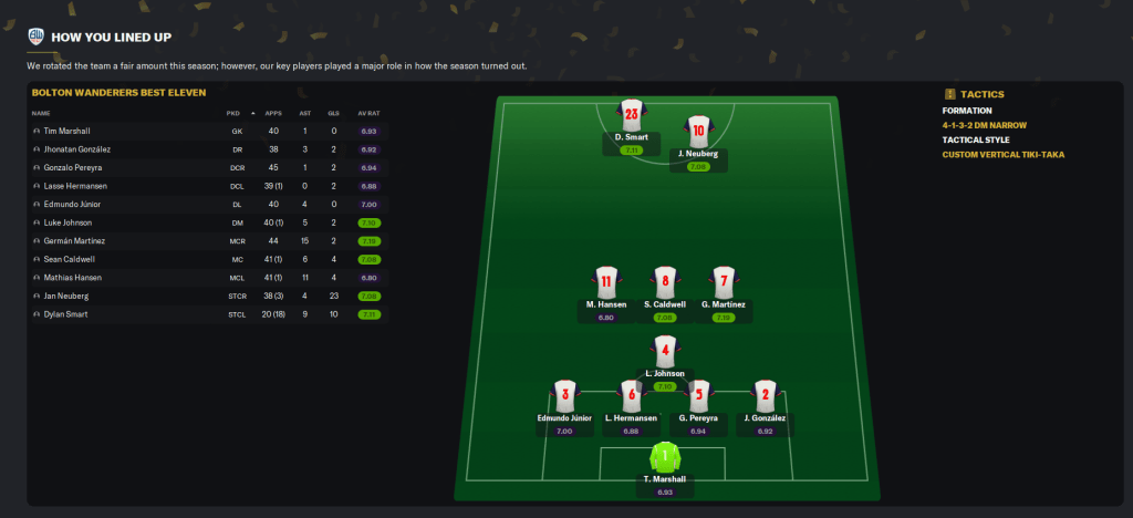 But the pivotal player in this squad has to be midfielder Martínez, who got a club record 15 assists alongside two goals and a 7.2 average rating. He’s worryingly wanted by Real Madrid and we may need to break the bank to renew his contract in the summer. Vice-captain Hansen also impressed with 11 assists and four goals. While holding midfielder Johnson popped up with five goals, two assists and a 7.1 average rating.