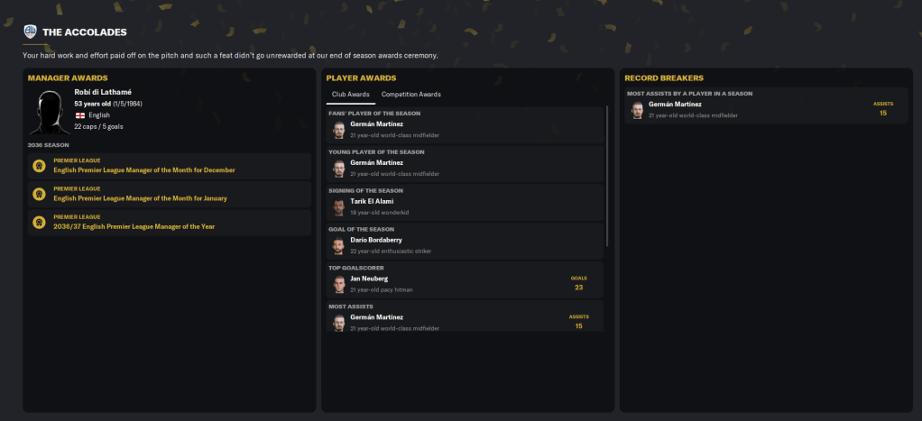 Martínez won the fans’ player and young player of the season, Neuberg, El Alami was signing of the season, Bordaberry won goal of the season, neuberg got the most player of the match awards (8) and Kristoffersen had the best passes completed ratio. Edmundo Júnior, Caldwell, Martínez and Neuberg were named in the league’s team of the year. And I won the Premier League Manager of the Year award.