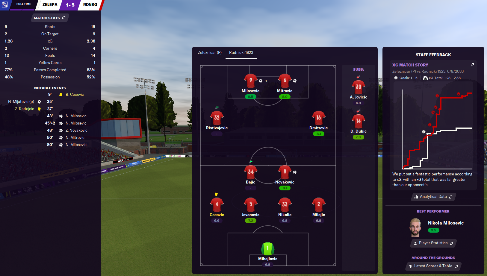 Latunov’s first away game took his side to Zeleznicar, who scored a dubious penalty. But another Milosevic brace turned things around before half-time then goals from Novakovic and Mitrovic sealed it before Milosevic wrapped up his hat-trick and a 5-1 thumping. Two games played, ten goals scored!