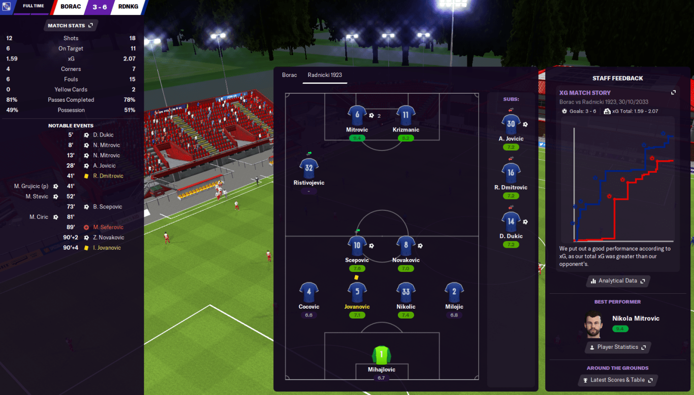 Motrovic began to step up as Radnicki scored straight from the kick-off inside 11 seconds at home to struggling Kolubara. Krizmanic scored his goal for the club and they somehow allowed the visitors a late goal to only win 2-1 despite 26 shots to three. A Scepovic goal was enough for a 1-0 win over next-to-bottom Buducnost on the same day that title favourites Vojvodina lost 5-1 at second-place Zemun.