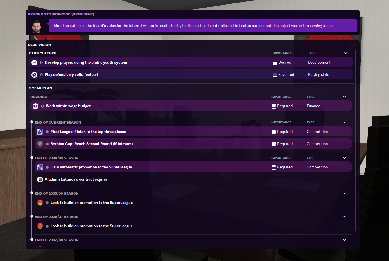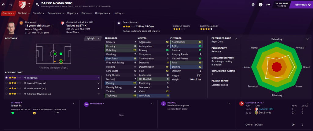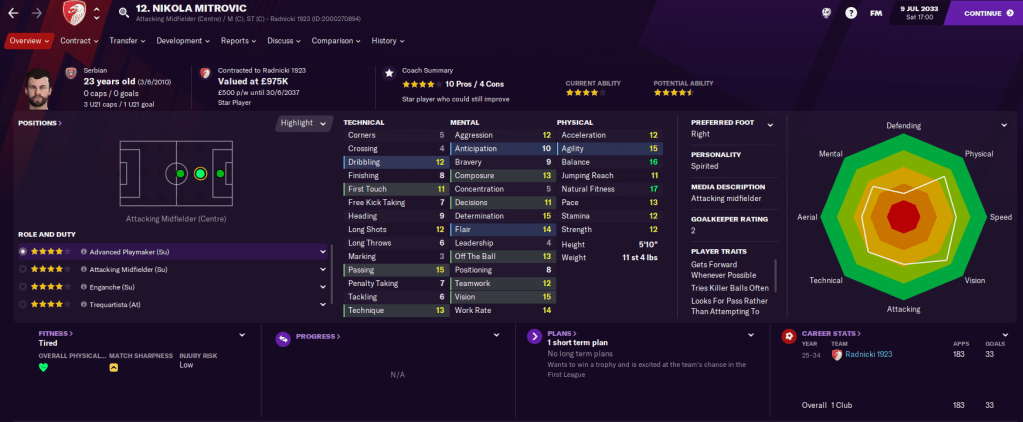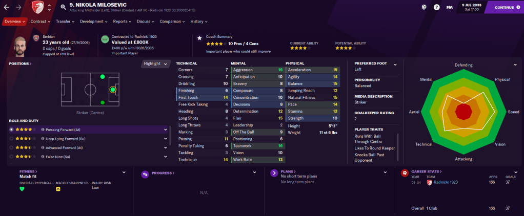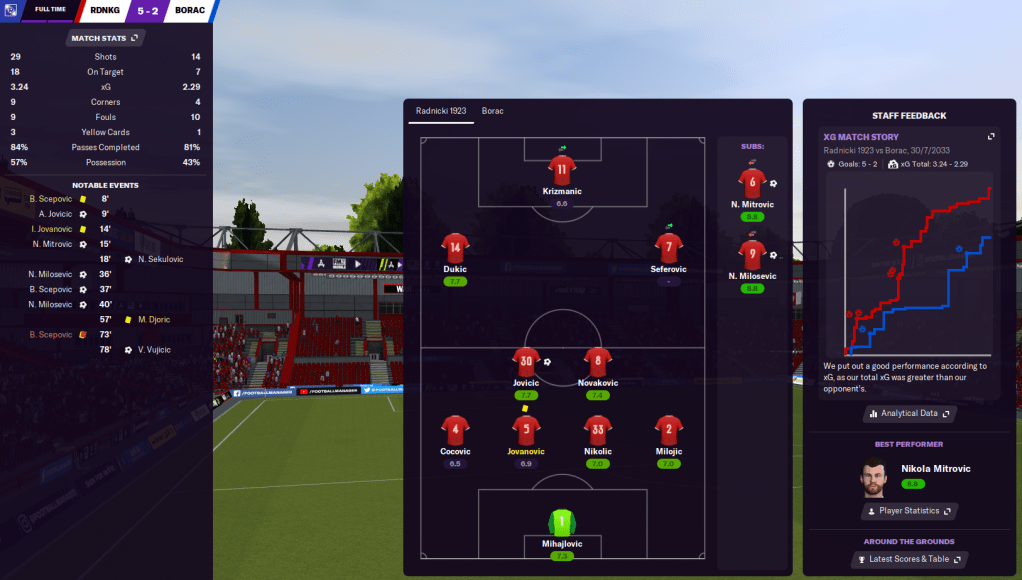 FK Radnicki 1923 was, unsurprisingly, formed in 1923 and plays in the Serbian city of Kragujevac at the 15,100 capacity Cika Daca. The club has never been national champion but won the second-tier First League three teams during this save. Radnicki was relegated from the Serbian Super League in the 2032/33 campaign despite the media predicting it would finish fourth and coming sixth the previous season!