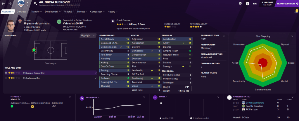 The first match of 2038 was an FA Cup clash with Bristol Rovers managed by Paul Pogba. A host of homegrown players came in and two scored in attackers Luca Godden and Dylan Smart along with Mexican wonderkid Luis Antonio Nava. That game saw 18-year-old goalkeeper Niksa Djerovic, who signed for £700,000 then went to MLS on loan, keep a debut clean sheet. The coaches rate him as our number one but he’s one of four strong goalkeepers.