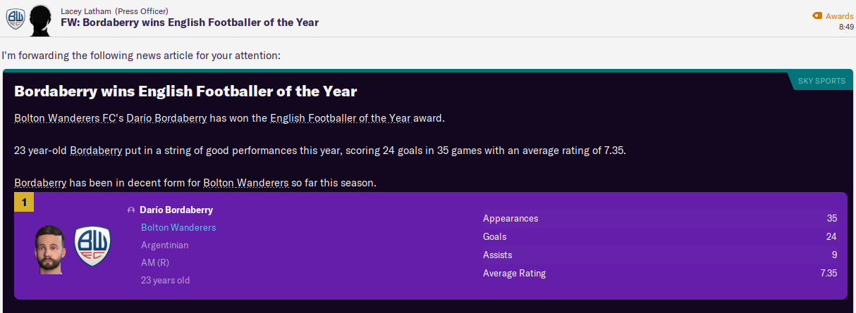 Bordaberry became the first Bolton player to win the English Footballer of the Year since Nat Lofthouse in 1952 and the first ever to win the English Players’ Player of the Year. While Neuberg became the second Bolton player to win the English Players’ Young Player of the Year, after Neal Vickers in 2034, and I won Manager of the Year for the third year in a row. We also had seven players named in the league’s team of the year.