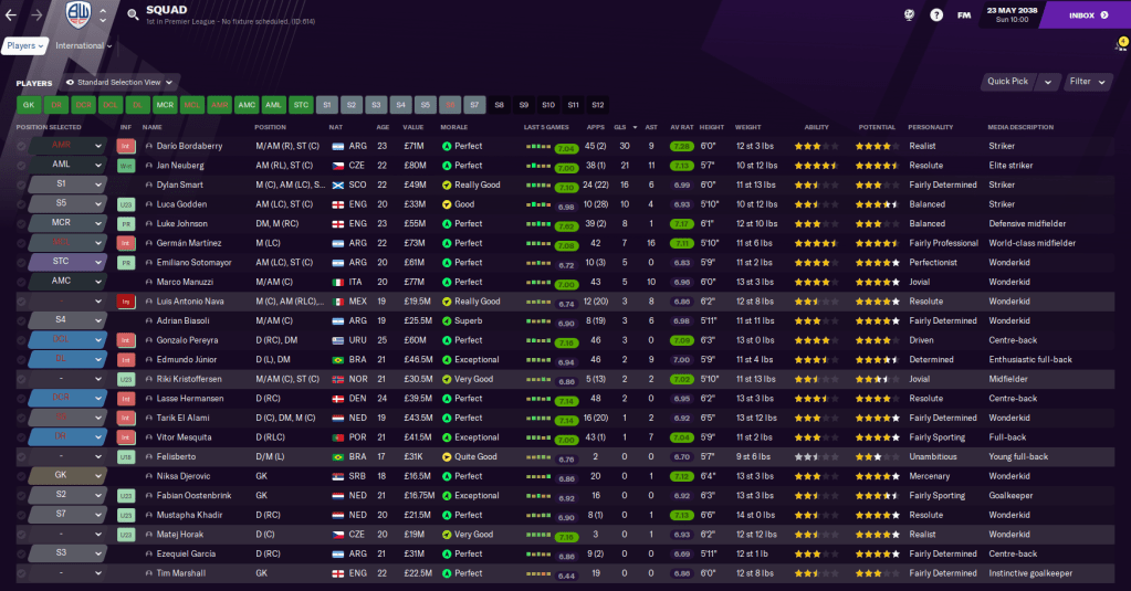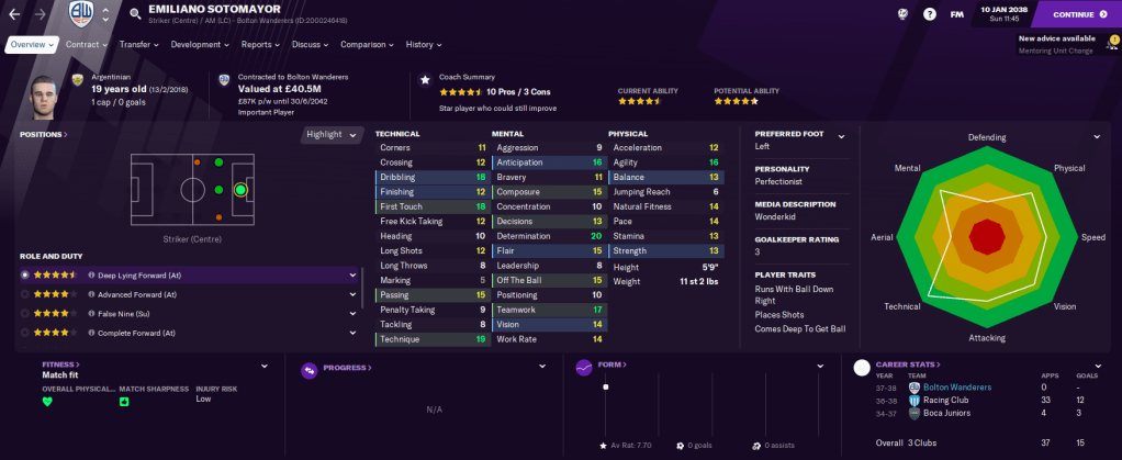 But those sales were long-forgotten as we broke the club transfer record for the second successive window with the signing wonderkid striker Emiliano Sotomayor. The 19-year-old got a 97 scout rating, which is the highest we’ve had so far, and cost £30 million, rising to £60 million, from Racing Club. He becomes the fifth Argentinian at the club.