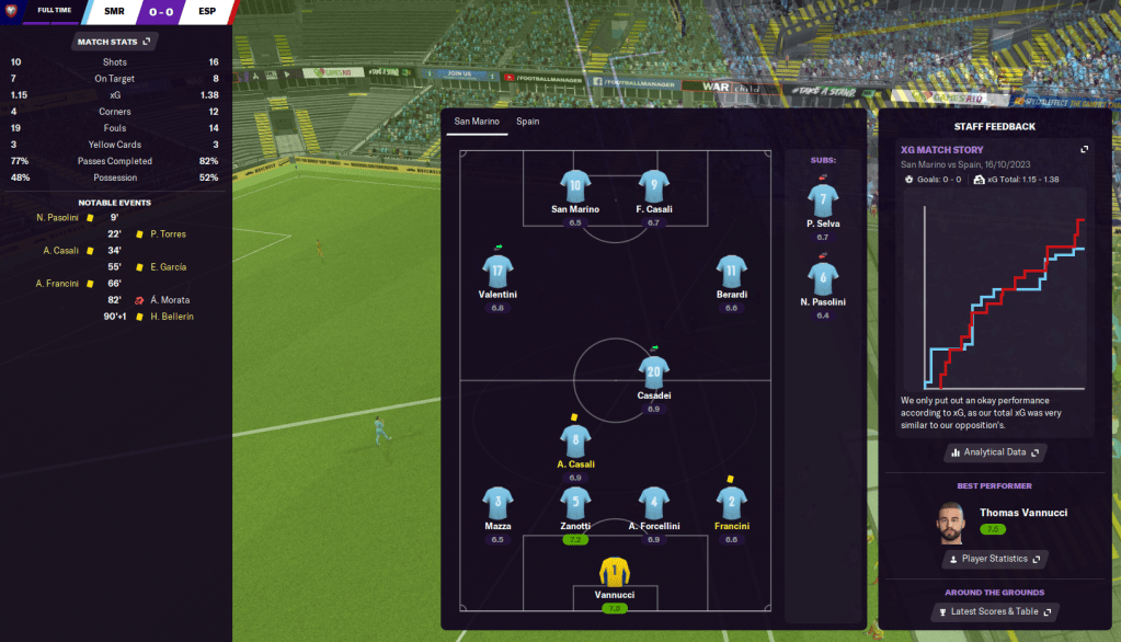 First up were whipping boys Malta, who’d only scored once and conceded 29 in eight games. And that showed in a dominant start for San Marino. DSM kept his hot form going by scoring inside two minutes followed by a Casali brace inside 21 minutes, which doubled his tally from his previous 16 caps. Malta got a goal back but DSM doubled his tally with a gorgeous chip on 40 minutes.