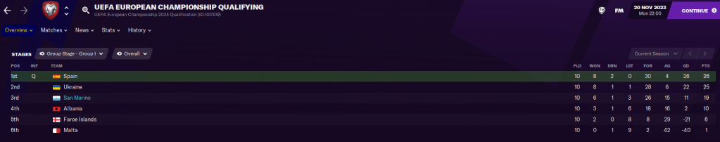 That ensured San Marino finished the group comfortably in third place, six points back from Ukraine in second and seven behind group winners Spain. They won six out of ten games with three defeats, and scored 26 and conceded 15. Their only draw of the group was against Spain, which was a ridiculous result!