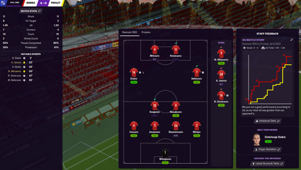 The Final Phase began at home to Proleter, in which left-winger Dobrivoje Dukic scored a first-half brace. He’d been poor through the first half of the season but Latunov had switched his support role to an Inside Forward (Attack) and he’d suddenly come to life. Dmitrovic and his replacement Seferovic scored after the break for a 4-0 win that sealed an immediate promotion one year ahead of the board’s schedule!