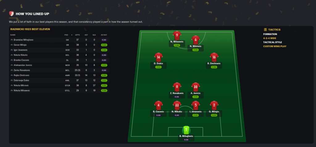 That ensured Radnicki 1923 finished the season unbeaten with 27 wins and 10 draws taking them to 91 points. They scored 90 goals and conceded 32, which was only bettered by Vojvodina’s 30. Mitrovic was the league’s top scorer with 27 goals in 37 games and Milosevic was third-top scorer with 19 in 29. While Dmitrovic and Dukic led the assists with 14 and 13 respectively and Milosevic had the highest average rating of 7.39.