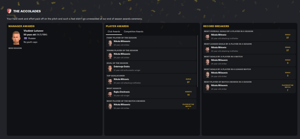 Latunov’s efforts in his former nation saw him win the Slovak Manager of the Year with a 53% win ratio at Nitra. And, interestingly, a Serbian player won European Golden Boy in Inter striker Stefan Gajovic, who just joined the club from Red Star.