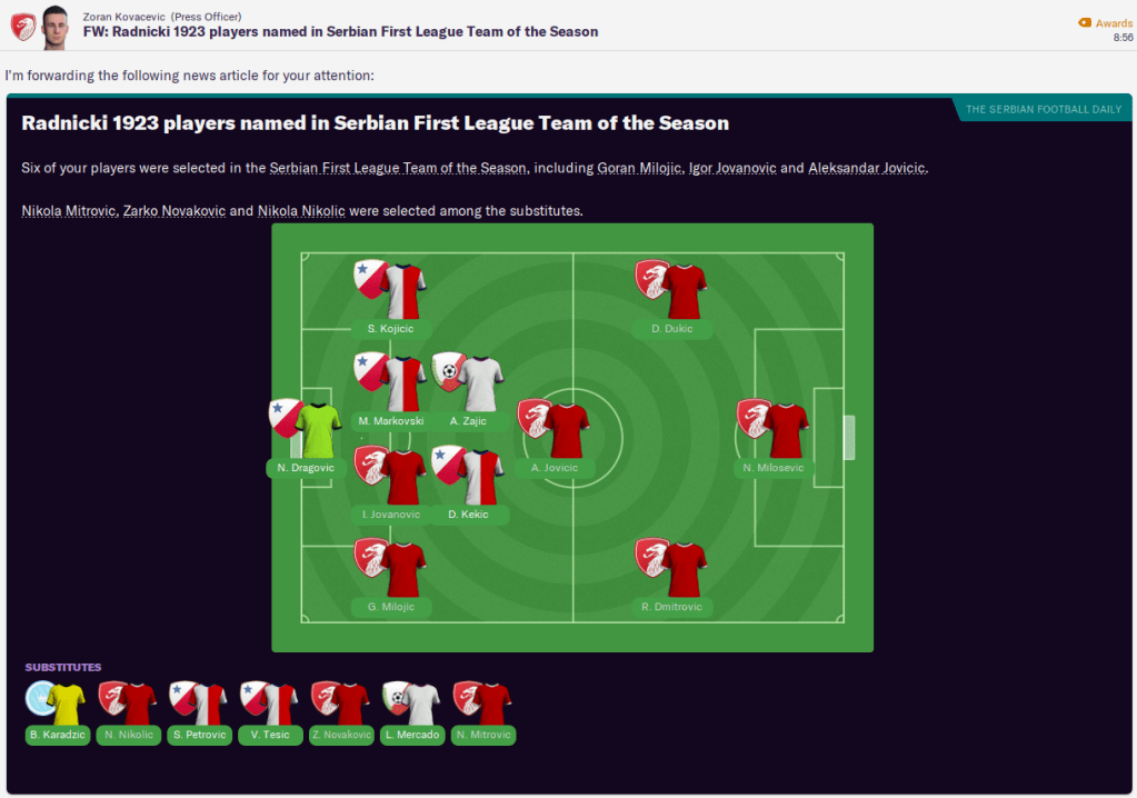Mitrovic also won the Serbian First League Player of the Season and Top Goalscorer awards, Latunov won Manager of the Season and nine players made the Team of the Season.