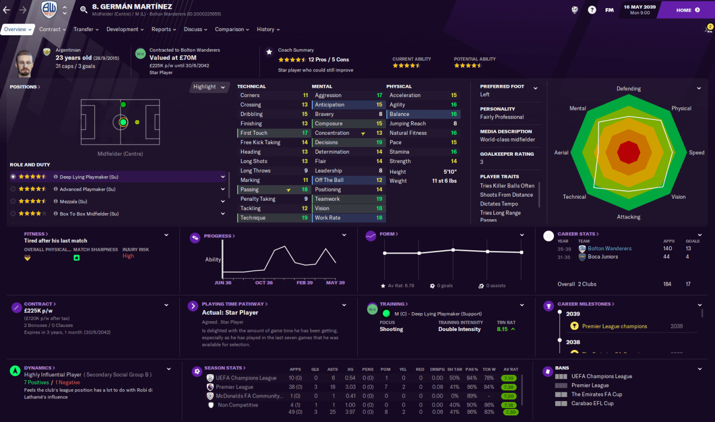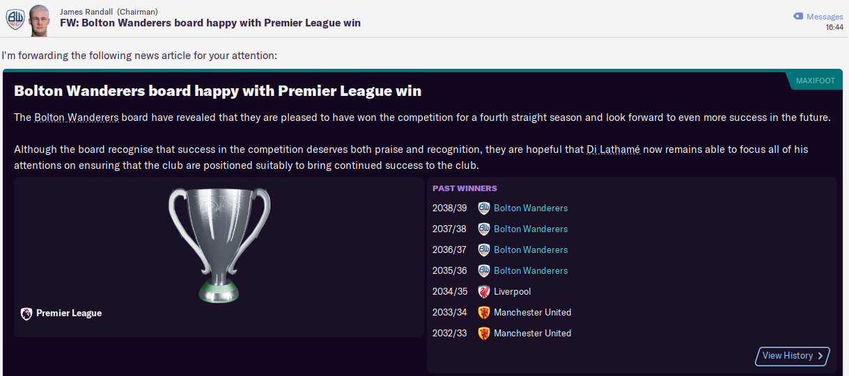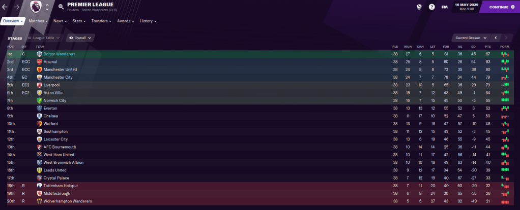 We may be getting close to the end of this save as we’re starting to dominate the English league and, after nearly 14 days of gametime, the game is getting slow. But we’ll definitely push into my 20th season as Bolton manager next time.