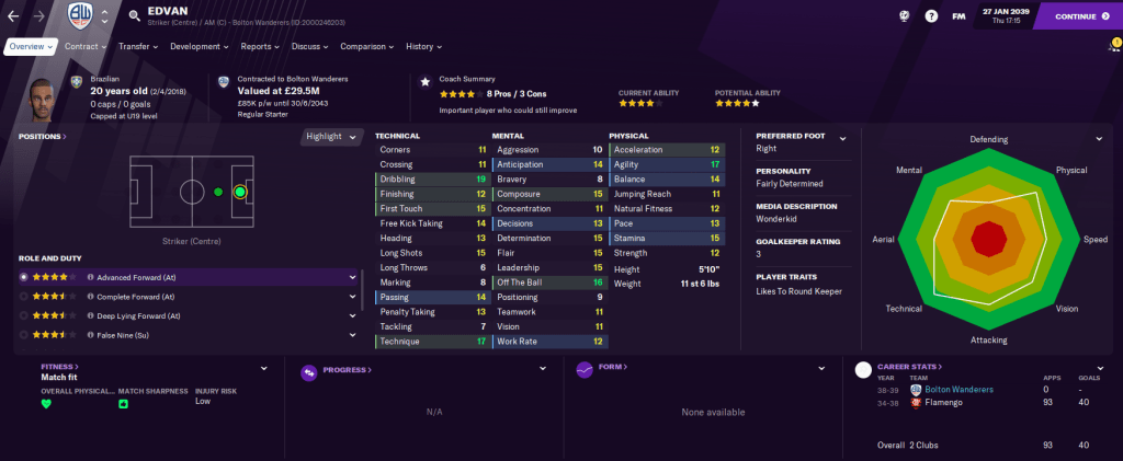 2039 began with a £150 million offer for star midfielder Germán Martínez from Real Madrid, but there seemed very little point in selling him for any fee. Academy product Tim Marshall, who’d been in really poor form, moved to Cardiff for a huge £22.5 million and attacker Darío Bordaberry, who, frankly, is a dickhead, went to Brighton for £30 million. We replaced Bordaberry with Brazilian wonderkid striker Edvan for £13.5 million from Flamengo.