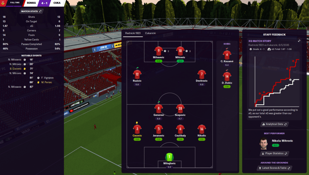 The team was slightly strugling for goals but the Nikola M strikeforce struck with a goal apiece to down Napredak 2-0. That moved them six points clear of the league split with just three games remaining. And they confirmed a top half finish with a 2-0 win over namesakes Radnicki, in which homegrown winger Jovan Ruzicic scored his first goal for the club.