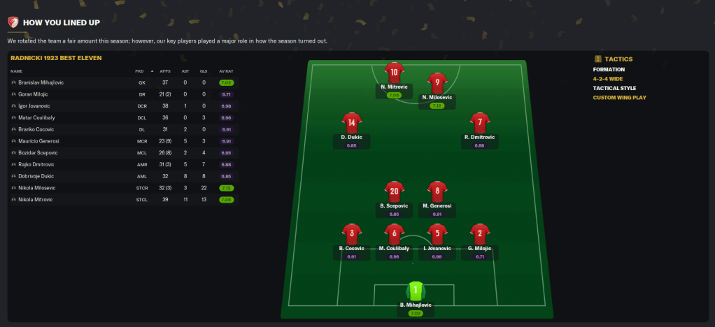 That ensured Radnicki 1923 finished in fourth place, which equalled the club’s highest-ever finish set back in 1945/46. They finished on 60 points, four ahead of Cukaricki and only five behind Red Star and second place Vozdovac. Milosevic finished as the second top scorer in the SuperLeague with 21 goals and the joint-most player of the match awards with seven, while Mitrovic had the joint-most assists with 11, but he only added one to his tally after the winter break.