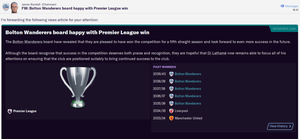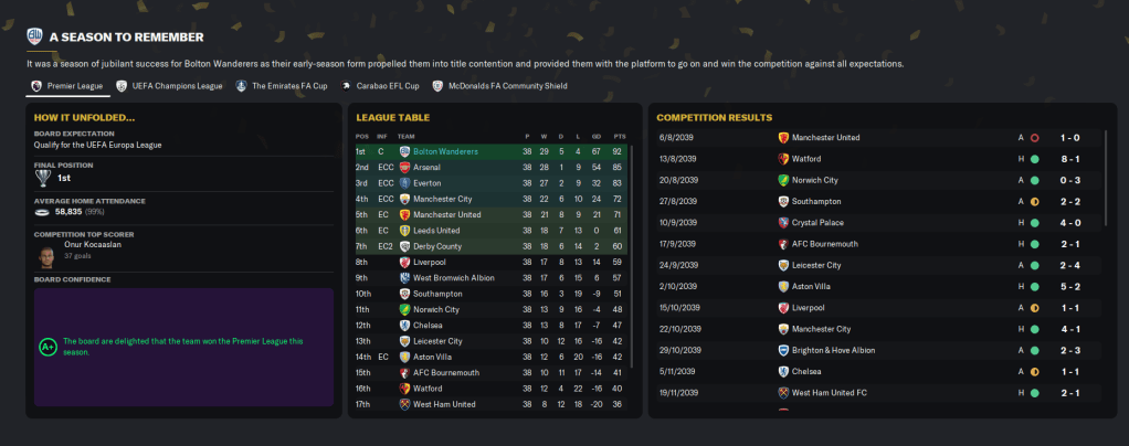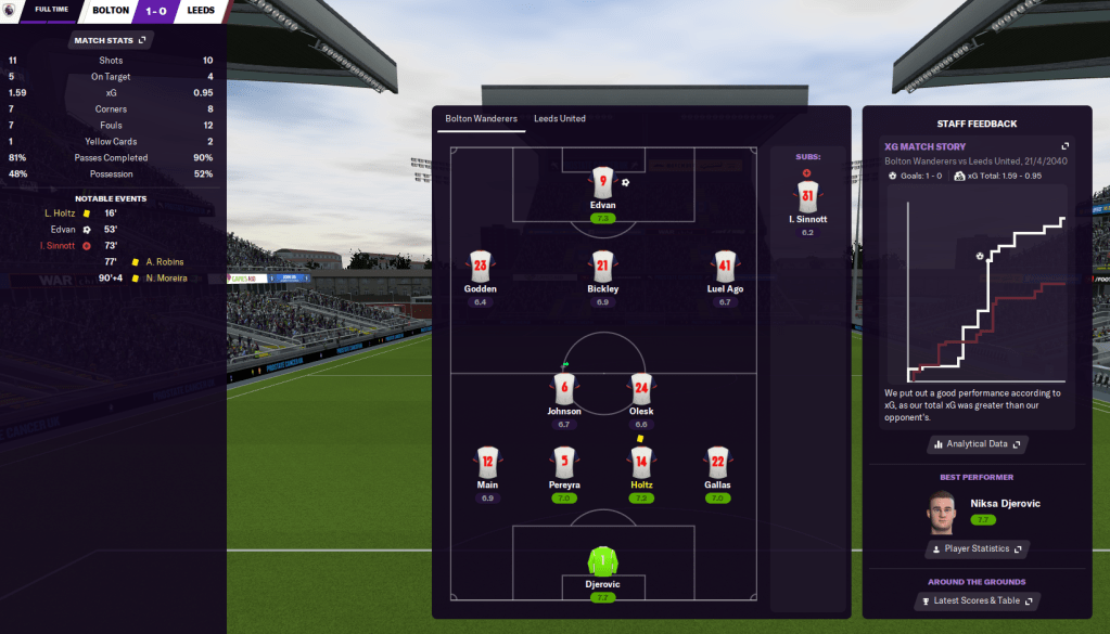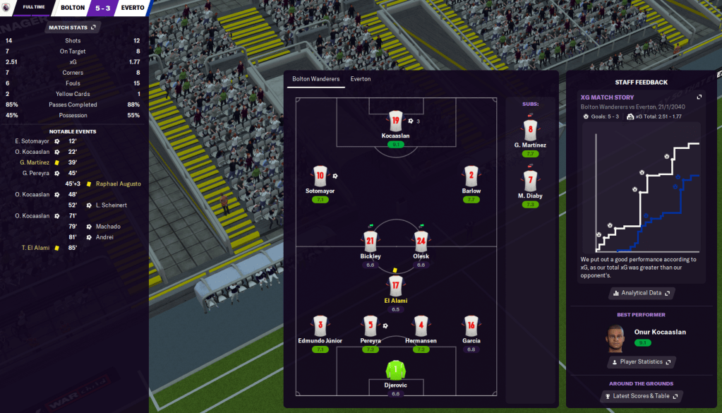 Bolton were chasing a fifth successive Premier League title and sat top of the table heading into the new year. We began 2040 at Watford and a Diaby brace had us 2-0 up inside 14 minutes then, for some reason, stopped playing and allowed them a goal back but held on for a 2-1 win. We then entertained Norwich and Bickley scored his first senior goal to tee up a 4-1 thumping. The same result followed at Palace thanks to a goal and two assists from fellow academy product Jack Barlow and a Martínez brace.