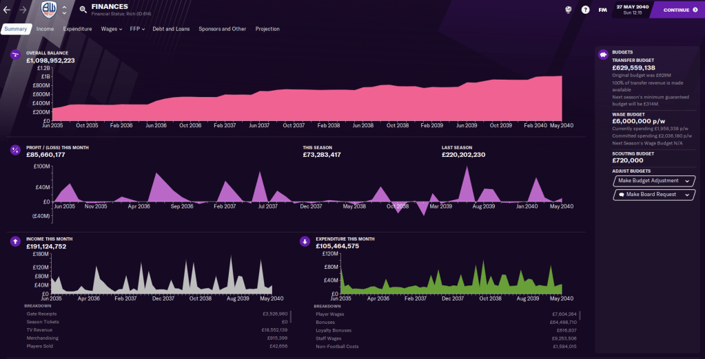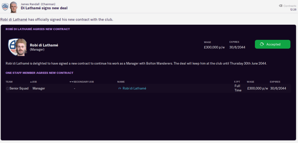 That win triggered the board to hand me a brand spanking new contract worth £300,000-per-week, which is £75,000 more than any of my players, until 2044. There’s also a £1 million bonus if we ever win the Champions League. Bling.