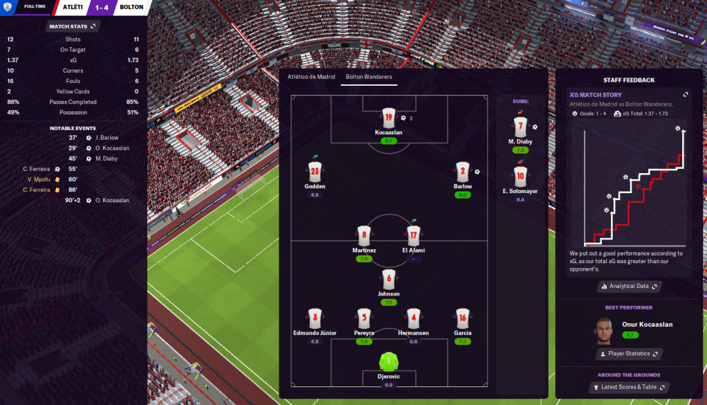 A slow start was ripped up as Barlow latched onto a Martínez to head home from close range on 27 minutes. Two minutes later, he crossed for Kocaaslan to slam home a header from six yards for his 45th goal of the season! We started to run away with it as Kocaaslan latched onto a Djerovic and sent Diaby through to make it three on 45 minutes. Atletico scored early in the second half but we went more defensive to nullify them and Kocaaslan fittingly rounded off the rout with a late tap home from a Barlow pass. Bolton 4-1 Atletico Madrid.