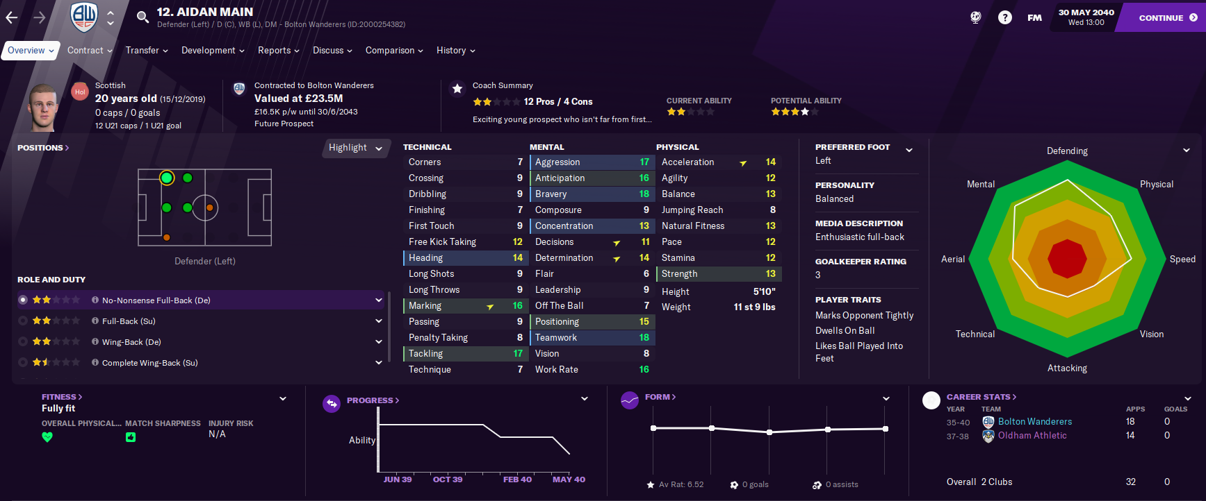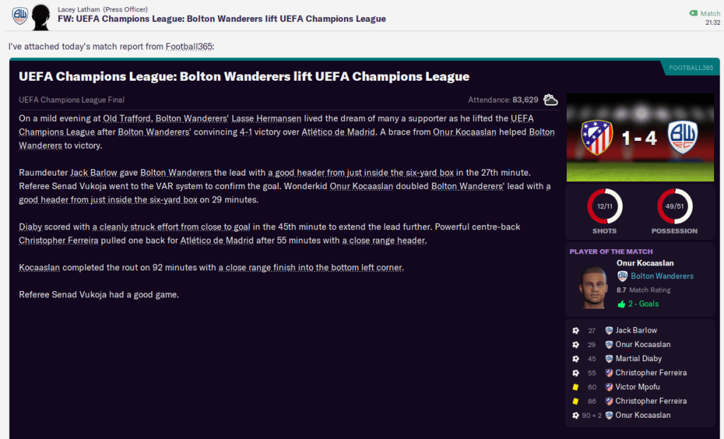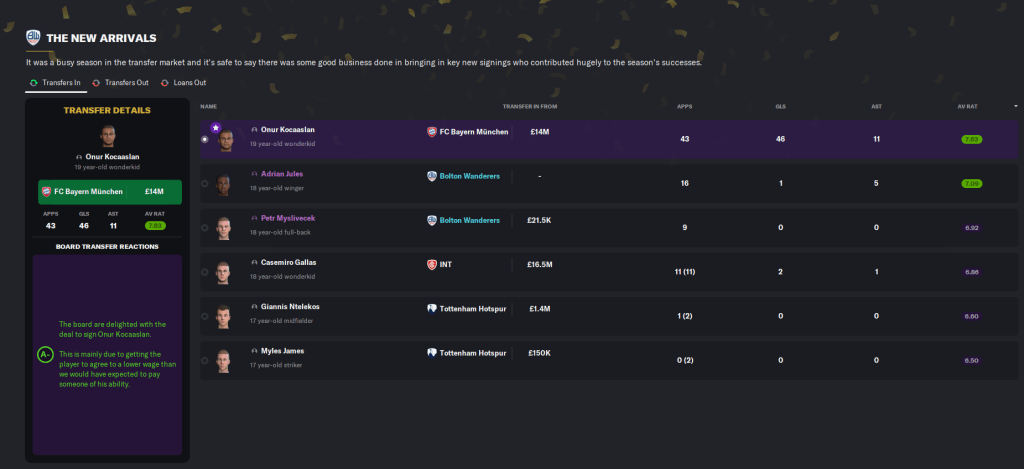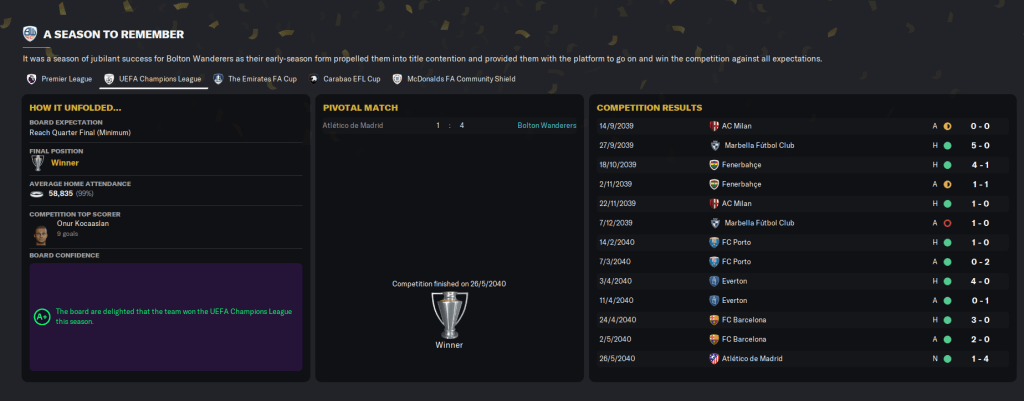 This has been a phenomenal season for Bolton, winning the Premier League and Champions League. It’s also been a crazy year for personal achievements. Kocaaslan smashed the club’s goalscoring record with 46 goals and 11 assists in 43 games at a new club record 7.63 average rating. He came second in the Champions League Golden Boot with nine goals in nine games and broke the club record for most goals in a match with a five-goal haul on his debut. The 19-year-old Turk won fans’ player and young player of the season and signing of the season. He has to be the best signing I’ve ever made on FM, considering he cost just £14 million in the summer.