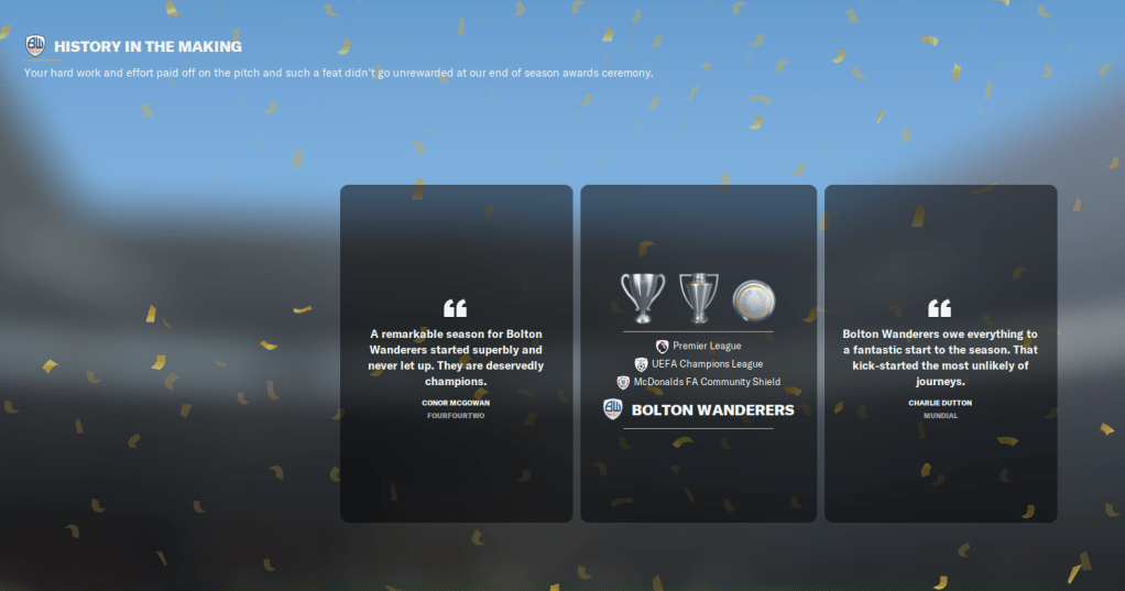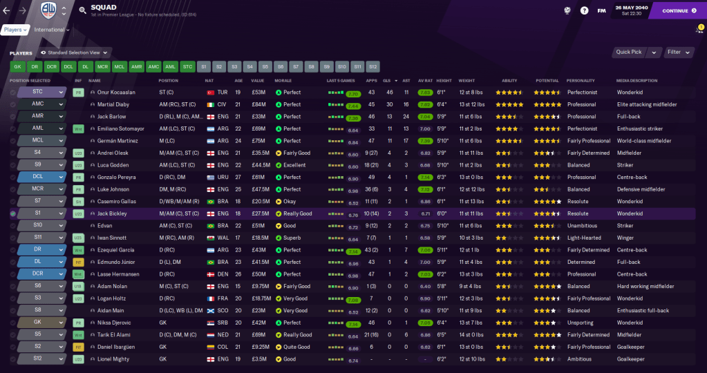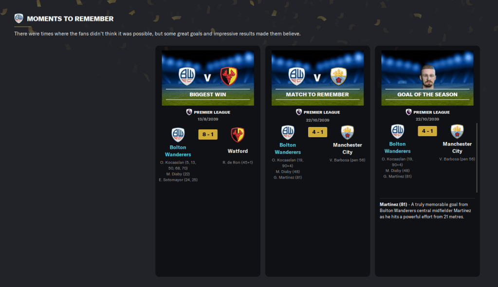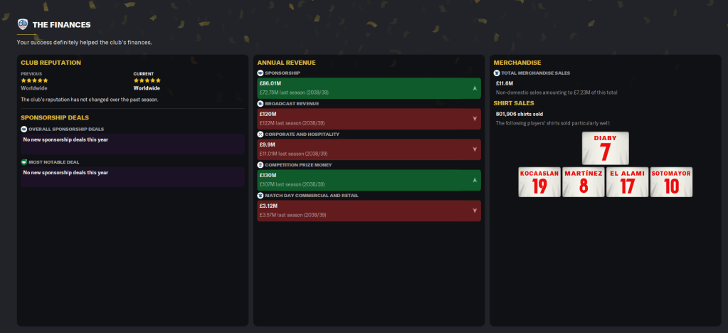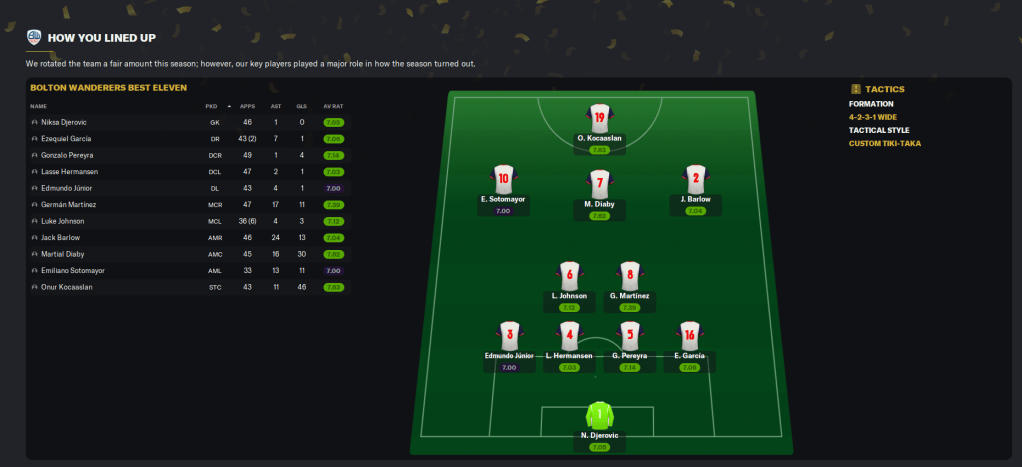 Diaby scored 30 goals and got 16 assists with an average rating of 7.62. While Barlow scored 14 goals and got 24 assists, Sotomayor scored 11 and got 13 assists and the ever-impressive Martínez scored 11 and got 17 assists. We also had 18 players score at least one goal and we scored 137 in all competitions. While in the Champions League, Djerovic won goalkeeper of the season, Pereyra won defender of the season, Diaby won midfielder of the season and Kocaaslan won forward of the season. What a campaign this was!! And to top it off, our bank balance surpassed £1 BILLION for the first time at the end of it!