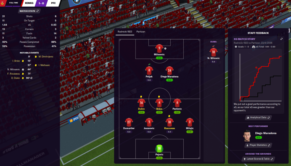 Game 2 – Cukaricki at home: They were much better early on against Cukaricki, as Diego Maradona superbly set up Poljak on nine minutes then doubled the tally six minutes before the break. A quiet second half meant it finished 2-0. And at the same time Red Star were held 0-0 at home by Vozdovac, which meant the cards were suddenly in Radnicki 1923’s hands as they moved two points clear at the top!