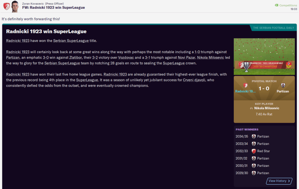 That final day drama ensured Radnicki 1923 finished top of the Serbian SuperLeague with 81 points, two clear of Red Star and six ahead of Partizan. They won 24, drew nine and lost four games. Milosevic finished as the top scorer in the league with 28 goals in 37 games, only adding six in 15 after the winter break. He also had the best average rating in the league of 7.40 and the most player of the match awards with 12. While Vukasin Pavlovic – who was on loan from Red Star – racked up the second-most assists with 10.