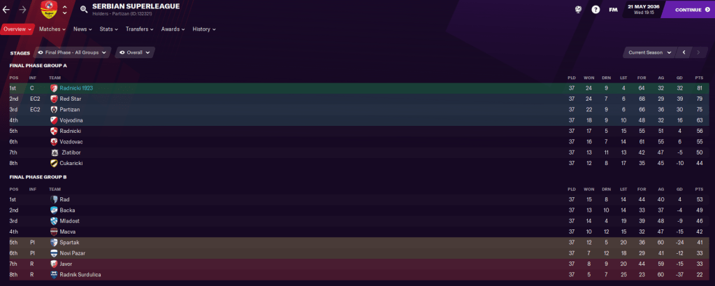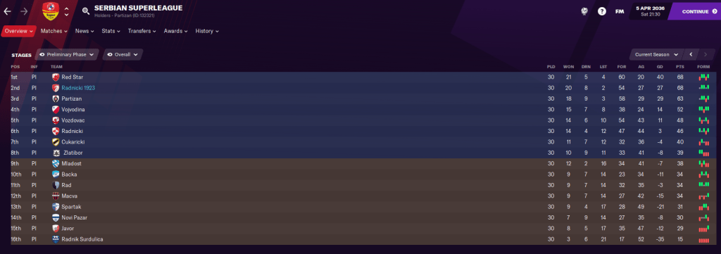The Final Phase began with a defence and midfield injury crisis, which wasn’t ideal given it began with a trip to Red Star – against whom Latunov had one draw and four defeats and Radnicki 1923 had only won three times in 25 games in this save. And that continued as Red Star unsurprisingly scored with their first shot and got a ridiculous penalty to win 2-1.