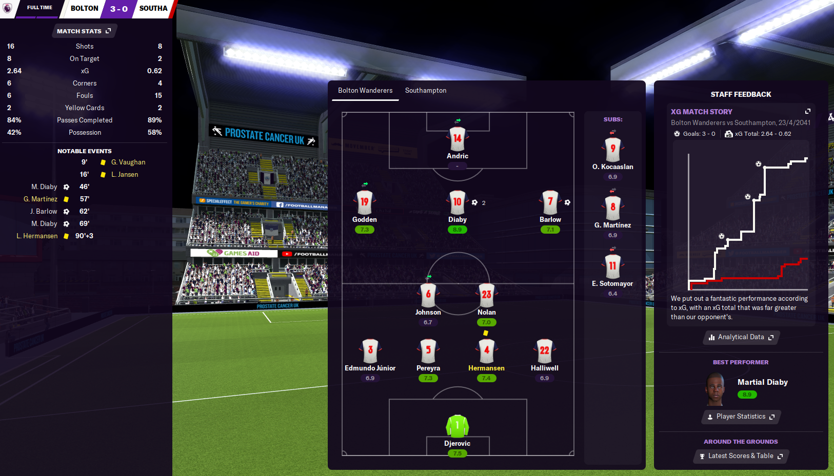 Our young starlets had been tasked with Carabao Cup duties and saw off three Premier League teams to reach the semi-finals. So I trusted them again in the two-leg clash with Championship side Cardiff. New boy Andric gave Bolton fans a taste of his talent by scoring 15 minutes into his debut, which was enough for a 1-0 win. But two late goals in the away leg saw Cardiff progress to face Liverpool in the final and surprisingly they won it 1-0!