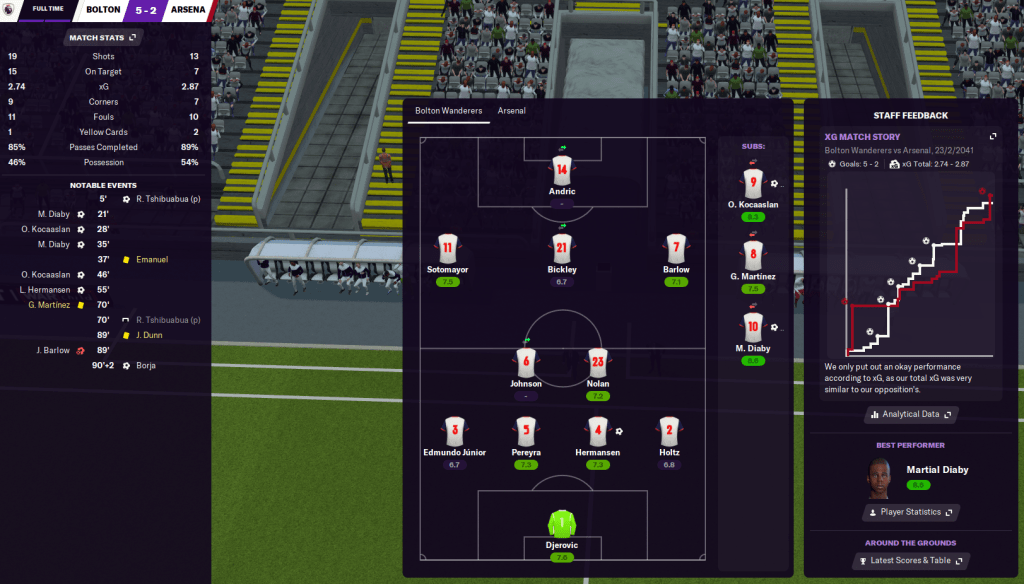 Our players finally got a rest thanks to a 15-day break, plus a week off for the two cup exits, which was useful as we welcomed fourth-place Arsenal to town at the end of February. Arsenal, who had two of our former midfielders Emanuel and Manuzzi starting, won a penalty in the first five minutes but a Diaby brace and Kocaaslan turned the game on its head in the next half hour. Kocaaslan bagged another 30 seconds after the break then an interesting short corner routine saw centre-back Lasse Hermansen turn home an Emiliano Sotomayor cross before Niksa Djerovic saved a second Arsenal penalty before a late consolation. And that was enough for an emphatic 5-2 battering, with Martínez getting two assists on his 200th Bolton league appearance, in which he now has 83 assists.