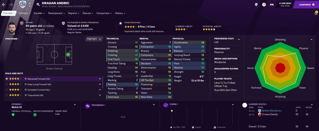 We didn’t sign any first-team players in the summer but I finally got a deal over the line for another wonderkid striker I’d been chasing for several years. 20-year-old Dragan Andric arrived for £26.5 million from Red Star, for whom he’d scored 34 in 52 as well as 20 in 19 for Serbia! We didn’t hugely need him, but I mainly signed him to stop Liverpool and Man United getting him!