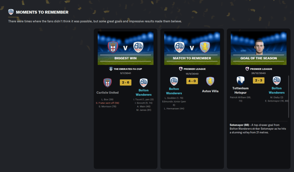 Diaby was the best performer this season with 18 goals and 10 assists at a 7.30 average rating. The 22-year-old, now known as an elite attacking midfielder, become just our second player to win the English Footballer of the Year, after Bordaberry in 2038, along with a clean sweep of awards with the English Players’ Player of the Year and Young Player of the Year. He also won the fans’ player and young player of the season and is now listed as a Bolton icon alongside Sean Caldwell. I’m the only Bolton legend alongside Nat Lofthouse, while Martínez and Kocaaslan are favoured personnel with Bordaberry and Guilherme – which I think is harsh on 300+ league game centre-backs Pereyra and Hermansen!