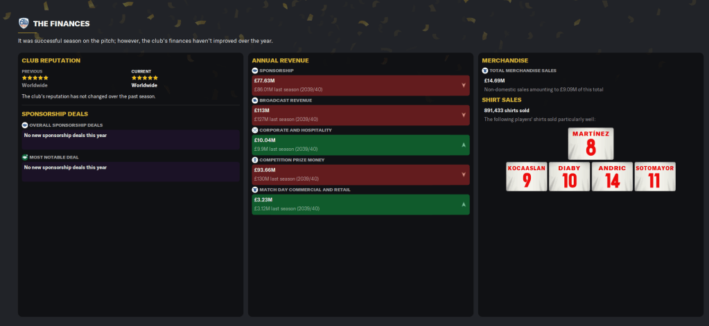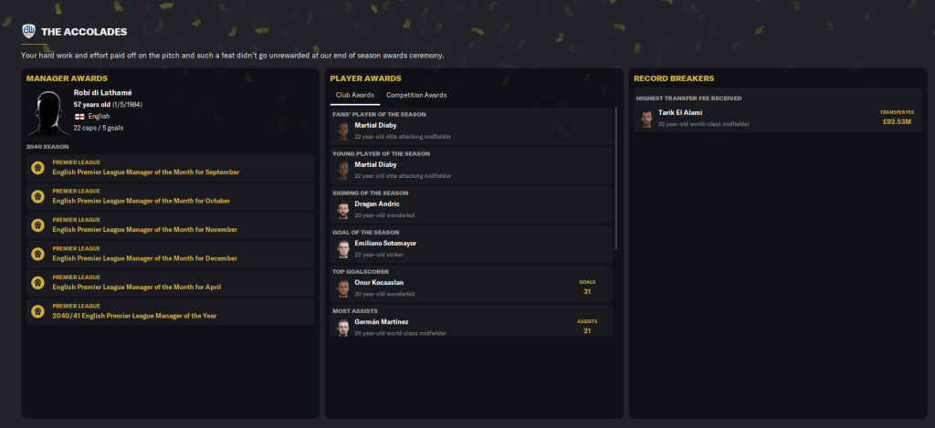 It was further highlighted by 2040 ending with a flurry of award recognition for our star players. Attacking midfielder Martial Diaby came second in the Ballon D’Or and FIFA FIFPro awards for the second year in a row, this time ousted by ridiculous PSG striker Oguzhan Topcu. Diaby also won the FIFA Best U21 Men’s Player award for the second year in a row, won his first African Footballer of the Year award and was joined in the FIFA FIFPro Team of the Year by Germán Martínez. While striker Onur Kocaaslan won the European Golden Boy, which Diaby won last year.